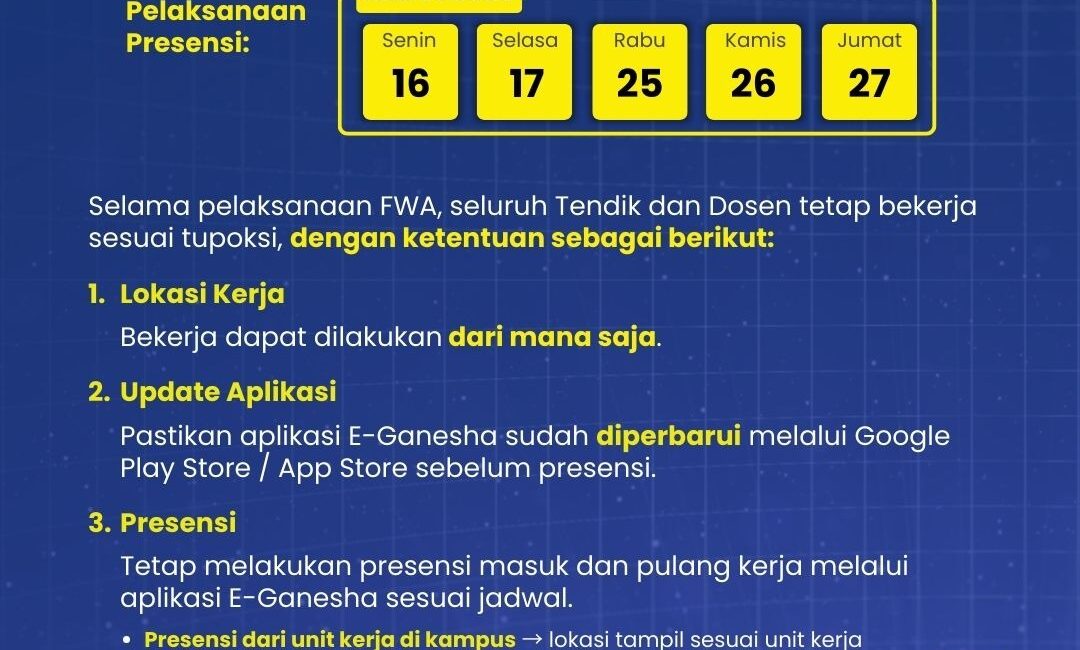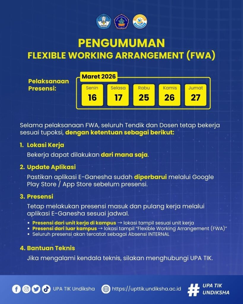 Menindaklanjuti edaran terkait pelaksanaan Flexible Working Arrangement (FWA) pada tanggal 16, 17, 25, 26, dan 27 Maret 2026, disampaikan ketentuan pelaksanaannya sebagai berikut: