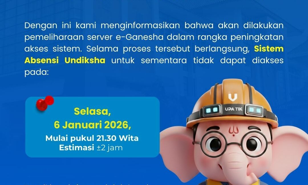 Dalam rangka peningkatan kualitas dan akses sistem, akan dilakukan pemeliharaan server e-Ganesha. Selama proses berlangsung, Sistem Absensi Undiksha untuk sementara tidak dapat diakses sesuai jadwal yang tertera.